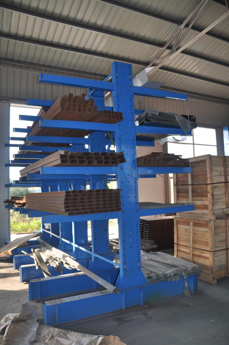 存放鋼制管件或者鋁制型材等,產品本身的長度一般為6m。輕型懸臂貨架和中型懸臂貨架是人工存放的貨架系統。通道尺寸1000-1500mm。高度一般為2m。在配套叉車使用后,高度可以做到5-12m。通道尺寸為2800-3000mm。需要使用專業叉車操作,這類貨架由于高度增加,和本身防止叉車作業風險的保護。會采用重型懸臂貨架要求設計。懸臂可以是單面或雙面,懸臂式貨架具有結構穩定,載重能力好、空間利用率高等特點。懸臂式貨架多用于機械制造行業和建材超市等。加了擱板后,特別適合空間小,高度低的庫房,管理方便,視野寬闊,利用率比普通貨架更高。懸臂式貨架是在傳統式貨架支柱上裝設外懸臂而成,是一種長形物專用的貨架。